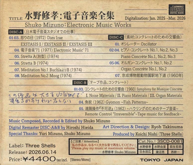 日本を代表する作曲家・水野修孝の約70年前の貴重なオープンリールテープから復元した『水野修孝電子音楽全集』(CD3枚組)を、2026年6月6日に一般発売いたします 。本作は、作曲者提供のテープを入念にデジタルリマスター化した、奇跡的な「音のタイムカプセル」です 。グループ音楽、NHK、ミルズ・カレッジという3つの時代で作った極限の作品。